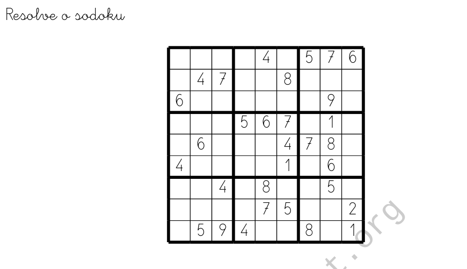 Sudoku, xogo tradicional do sudoku. Pódense facer sudokus cos números do 1 ó 4 (facendo sudokus de 4x4 de tamaño), ou cos números do 1 ó 9 (facendo sudokus de 9x9).
