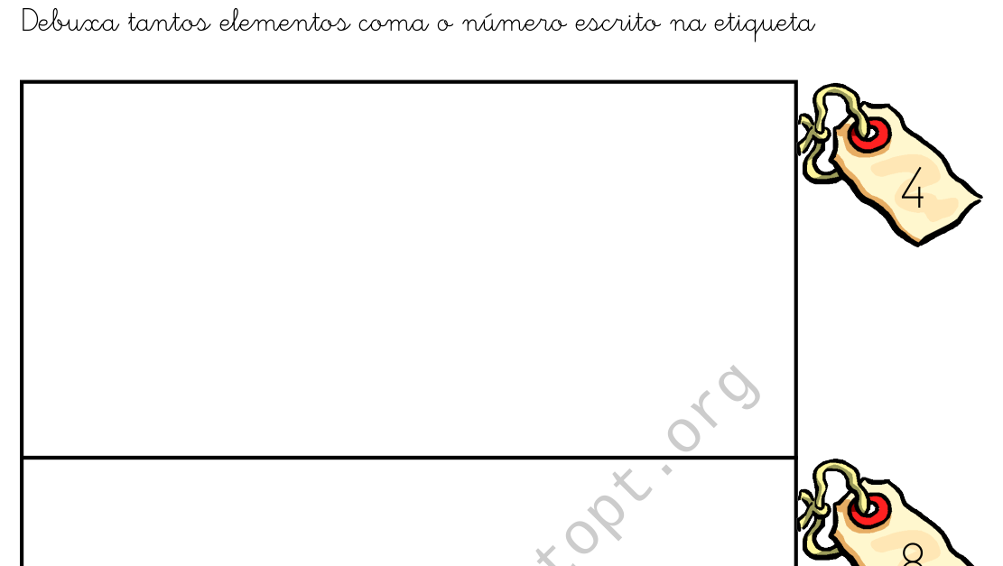 Este é o exercicio inverso ao exercicio Contar imaxes. Neste caso preséntaselles ao alumnado un número e ten que debuxar no interior da caixa a cantidade de obxectos que se lle pida.