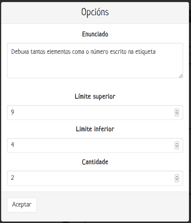 - Enunciado: o enunciado que aparecerá escrito co exercicio na ficha.