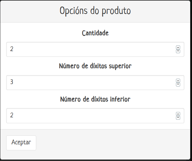 - Número de dixitos da parte superior: número de dixitos que terá o número que aparece na parte superior da multiplicación. Deste xeito se limita o valor que pode coller este número. Por exemplo, con 3 díxitos o valor estará comprendido entre 100 e 999.