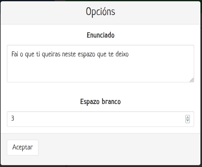 - Espazo: o número de liñas en branco que se deixarán para que o alumno escriba o que se lle mande.