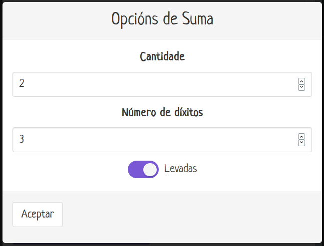 - Numero de díxitos: o número de dixitos que terán cada un dos sumandos. O número calculado aleatoriamente irá dende 1 ata o número máximo que se poida representar con ese número de díxitos.